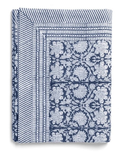 En elegant duk i bomull av høy kvalitet med et vakkert blomstermønster og en dekorativ kant. Mønsteret er trykt for hånd ved hjelp av tradisjonelle teknikker fra Indian. Et unikt håndverk som gir hver duk et unikt uttrykk. Vask duken på et kort (maks. 1 time) og skånsomt program for ull/silke med mildt vaskemiddel. Strykes som bomull.