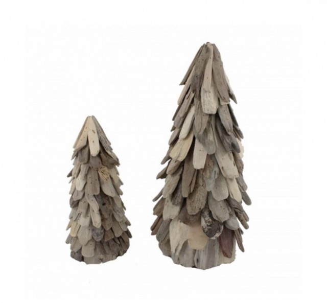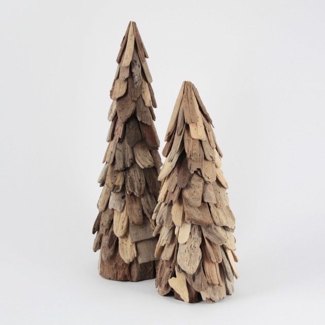 Drivvedens uperfekte utseende gir denne juledekorasjonen et uformelt uttrykk, samtidig som det enkle og stramme designet gjør at trærne passer inn i de fleste interiørstiler.