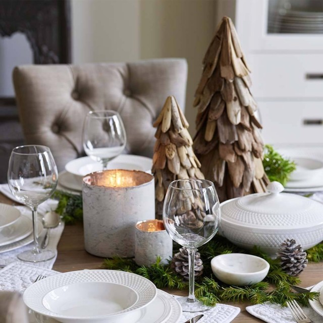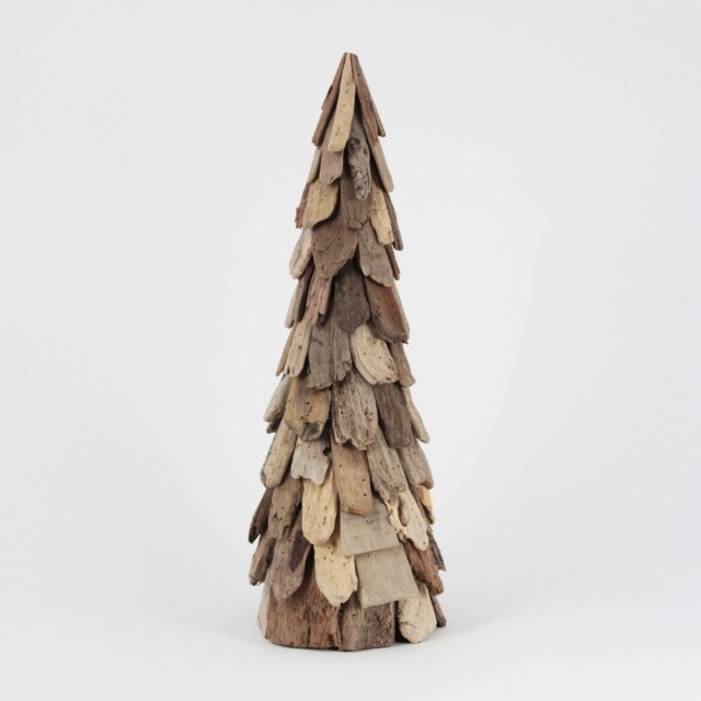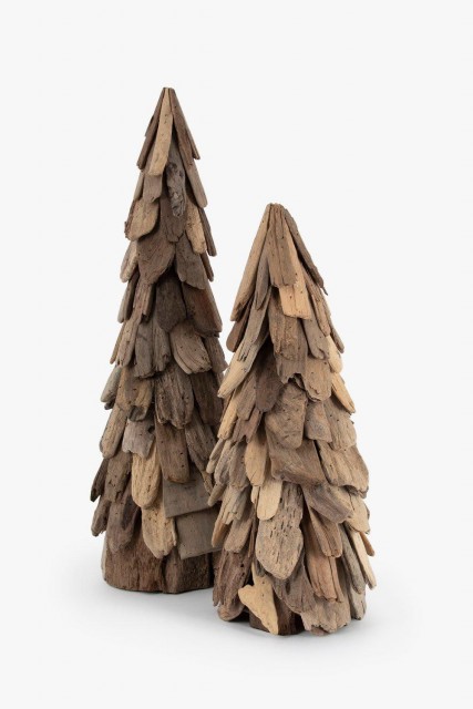 Drivvedens uperfekte utseende gir denne juledekorasjonen et uformelt uttrykk, samtidig som det enkle og stramme designet gjør at trærne passer inn i de fleste interiørstiler.