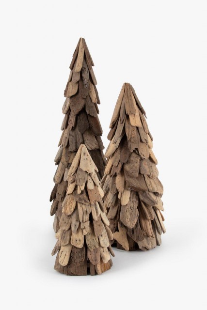 Drivvedens uperfekte utseende gir denne juledekorasjonen et uformelt uttrykk, samtidig som det enkle og stramme designet gjør at trærne passer inn i de fleste interiørstiler.